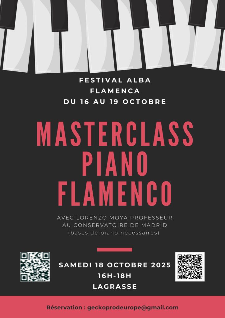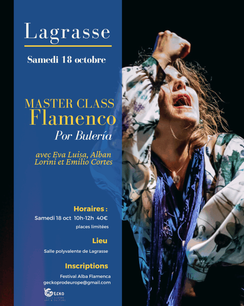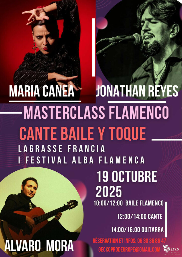 Dans le cadre du Festival Alba Flamenca, Gecko Prod Europe propose des masterclass ouvertes à tous : danse, guitare, piano, chant. Animées par des artistes de renom, ces sessions permettent d’entrer au cœur de la pratique flamenca, d’en comprendre les codes et les rythmes, et de partager un moment privilégié d’échange et de transmission.